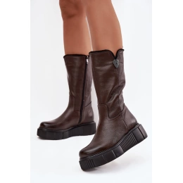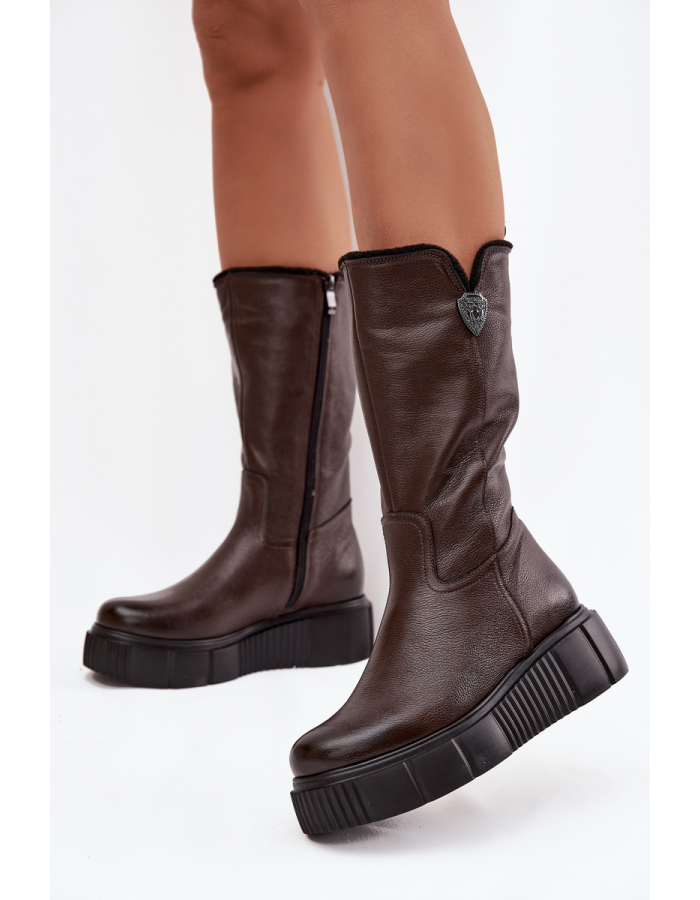 Damskie kozaki zostały wykonane z naturalnej skóry. Model ten posiada suwak z boku cholewki. Wnętrze zostało ocieplone naturalną wełną. Zapiętek jest usztywniany. Kozaki osadzono na masywnej platformie oraz koturnie. Posiadają ozdobny element z boku cholewki. Ten model świetnie sprawdzi się podczas chłodnych, zimowych dni. Przy wyborze rozmiaru prosimy sugerować się tabelą rozmiarów.