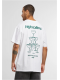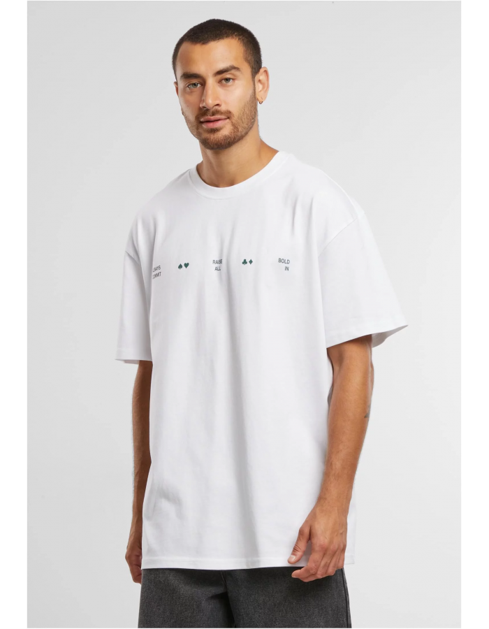 Zadní strana trička má větší potisk s nápisem "highrollers" v horní části, pod kterým je vyobrazen grafický motiv pyramidy tvořené šampaňskými skleničkami. Pod touto grafikou je text "High Stakes, Deep Risks" a opět symboly karetních barev. Design trička evokuje atmosféru hazardu a vysokých sázek, což může oslovit ty, kteří mají rádi tematické a odvážné oblečení. Tričko je moderní a stylové, ideální pro uvolněný, ale zároveň výrazný vzhled.