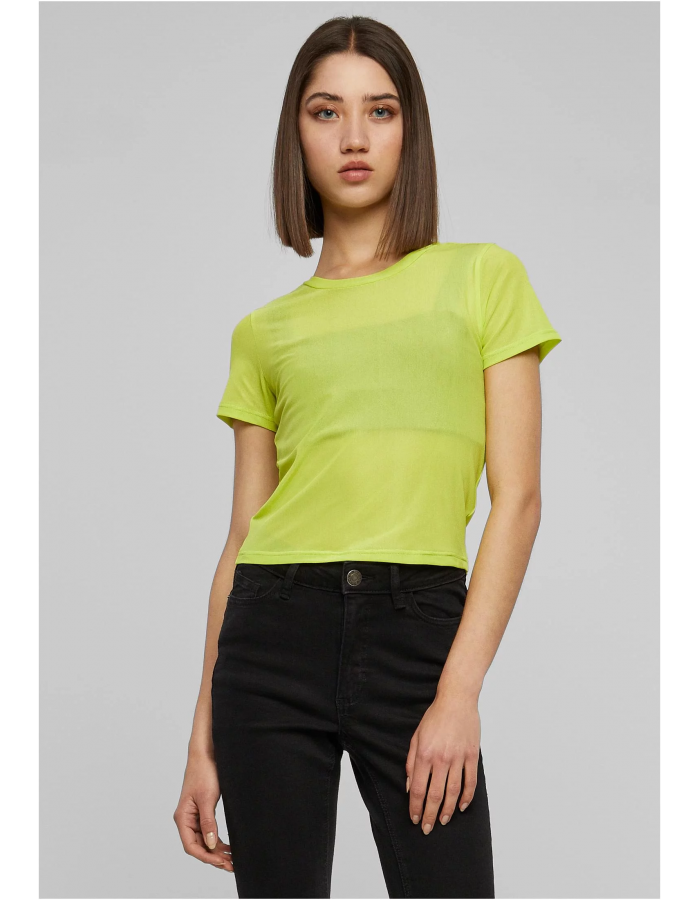 The women's tee presents a tight, cropped cut and a comfy slim fit. The used material, made of polyamide and elastane, is slightly transparent. An edged crew neck and short sleeves complete the design.