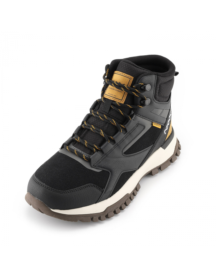 Obuv je vybavena klasickým šněrováním s pevnými tkanicemi, které zajistí spolehlivou fixaci chodidla. Patní poutko usnadňuje obouvání. Stylový vzhled doplňuje ozdobné prošití, měkký a hřejivý lem, vnitřní materiál a logo NAX umístěné na boční straně boty.