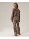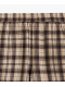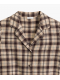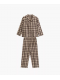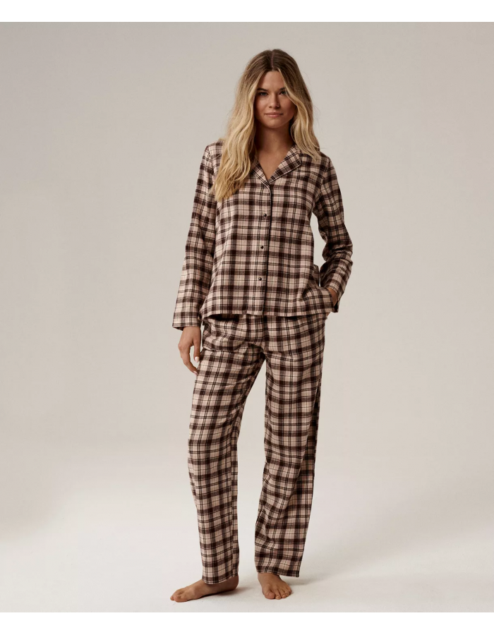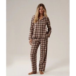 Ta damska piżama w brązowo-beżowo-ecru kratę składa się z koszulowej bluzki z długim rękawem oraz spodni z szerokimi nogawkami. Bluzka została zaprojektowana z kołnierzem, dekoltem w kształcie litery V i klasycznym zapięciem na guziki. Spodnie posiadają boczne kieszenie i wygodny, nieuciskający pas ze ściągaczem.