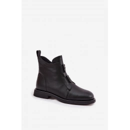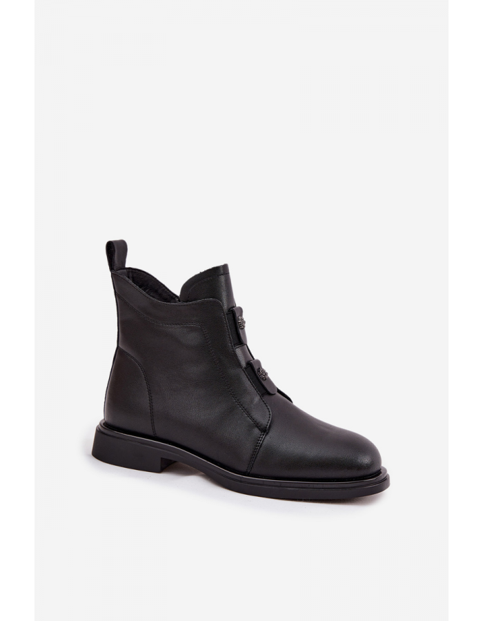 Botki damskie wykonane z naturalnej skóry. Osadzone na płaskim obcasie, który zapewnia wygodę podczas codziennego noszenia, a miękkie ocieplenie sprawia, że buty idealnie sprawdzą się w chłodniejsze dni. Zapinane na zamek, gwarantują łatwe zakładanie i dobre dopasowanie do stopy. Z przodu znajdują się subtelne, ozdobne detale, które dodają całości elegancji i delikatnego charakteru. Zaokrąglone noski. To uniwersalne botki, które świetnie dopełnią zarówno codzienne, jak i bardziej eleganckie stylizacje. Przy wyborze rozmiaru prosimy sugerować się tabelą rozmiarów.